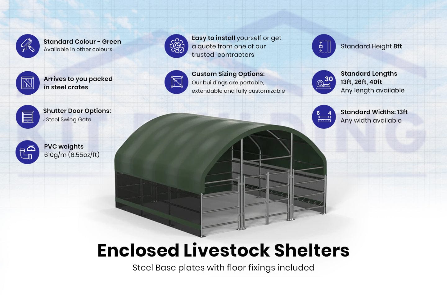 يعتمد حجم الملجأ المغلق للماشية الذي تحتاجه على عدد الحيوانات التي لديك. لدينا ثلاثة أحجام قياسية متاحة، 13 × 13 × 8 قدم، 26 × 13 × 8 قدم و40 × 13 × 8 قدم. بالإضافة إلى هذه الأحجام القياسية الثلاثة، يسعدنا أيضًا تصميم هيكل يلبي أبعادك المخصصة. فقط تأكد من إبلاغنا بمتطلبات الحجم عند الطلب.